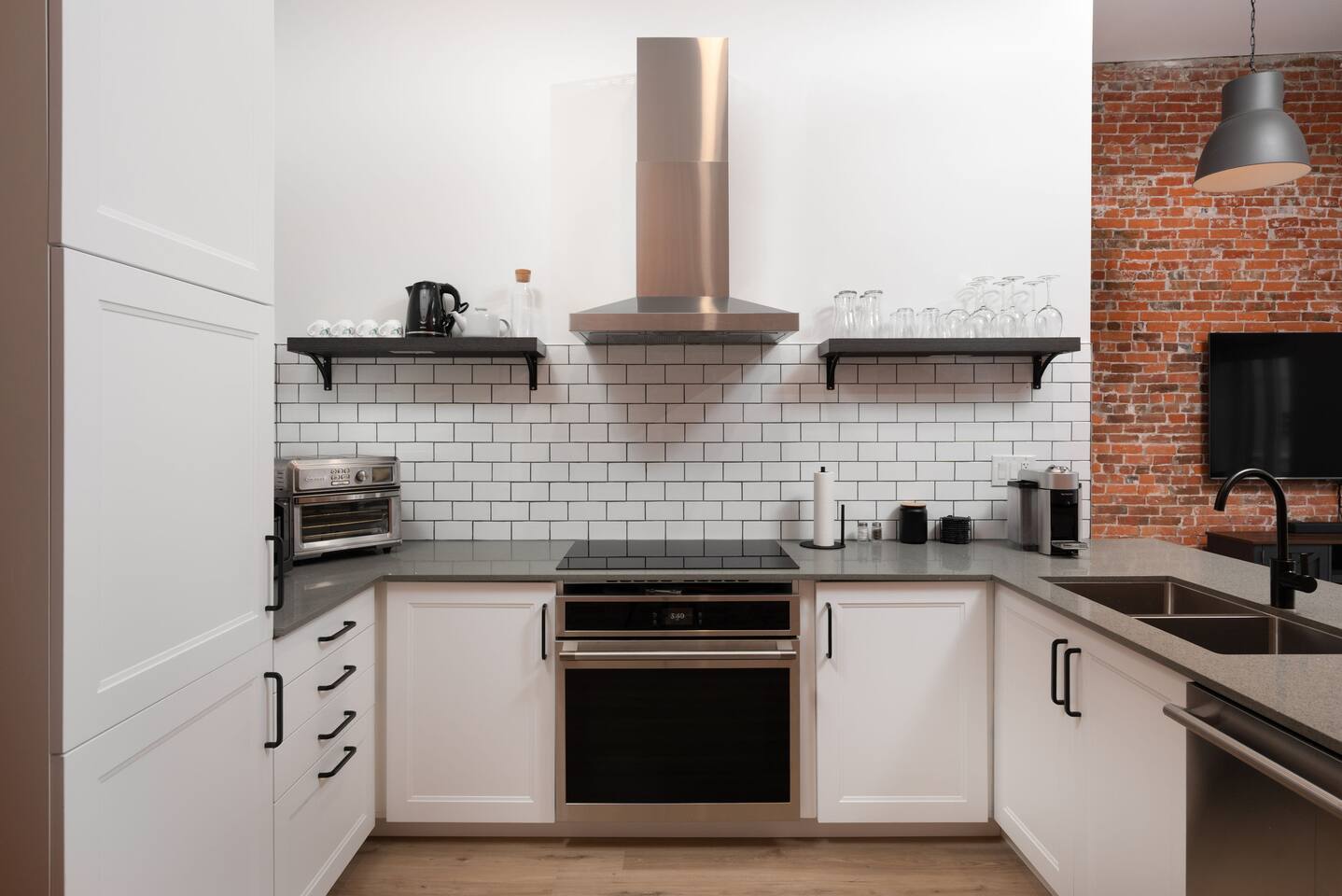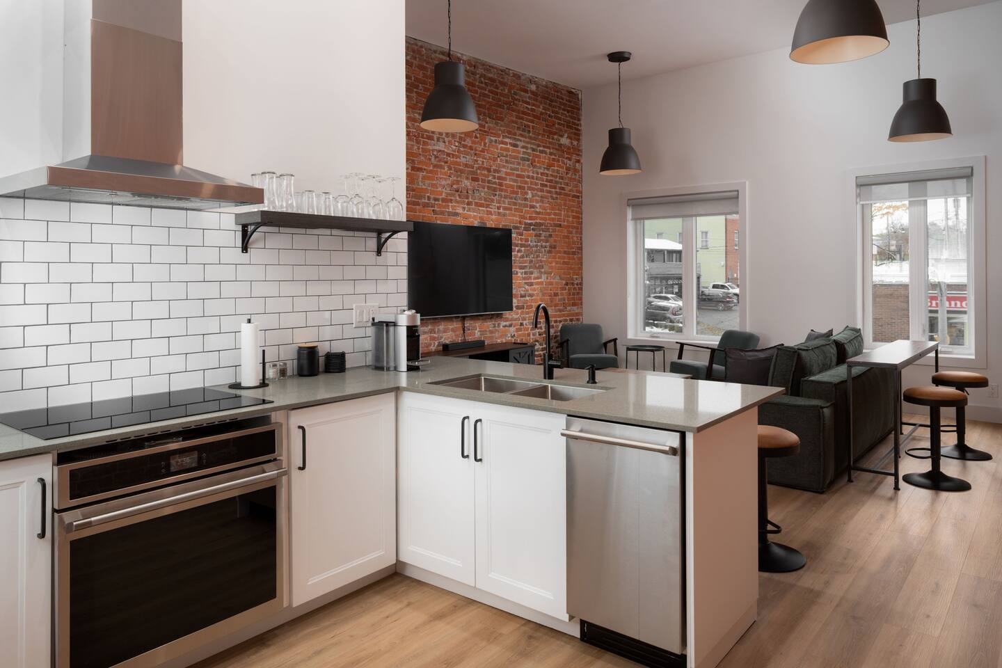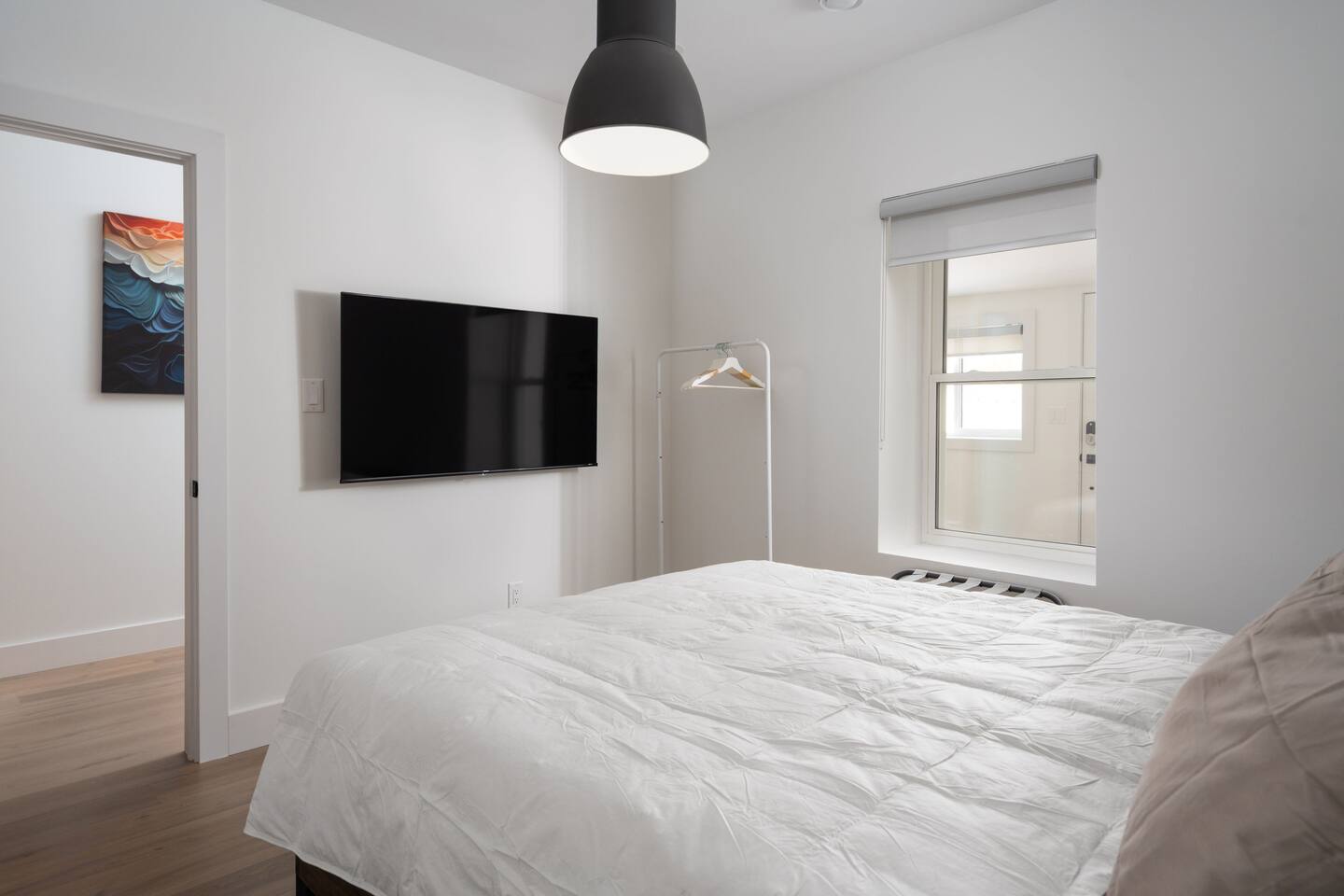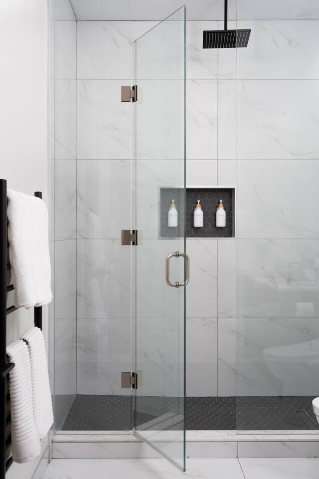 Welcome to a beautifully curated residence where modern luxury meets timeless elegance. The open-concept living area is designed for both comfort and style, featuring a sofa bed and accent chairs, and a 60-inch TV. Perfect for intimate gatherings or relaxing evenings. The gourmet kitchen is fully equipped with an induction range, cookware, and all the essentials, allowing you to prepare meals with ease and sophistication. There is also a Nespresso machine with a few pods to get you started. Each of the two bedrooms offers a serene retreat. One bedroom has a King Bed, and the second has a Queen Bed. All linens and duvets are provided. There is an ironing board/iron and luggage racks. TVs are located in both bedrooms. The bathroom suite elevates the experience with a private ensuite boasting a double vanity, bidet, heated toilet seat, heated floors, towel warmer and a rainfall shower head. A hair dryer is located in the vanity as well. For added convenience, a dedicated parking space is located at the entrance of the unit.